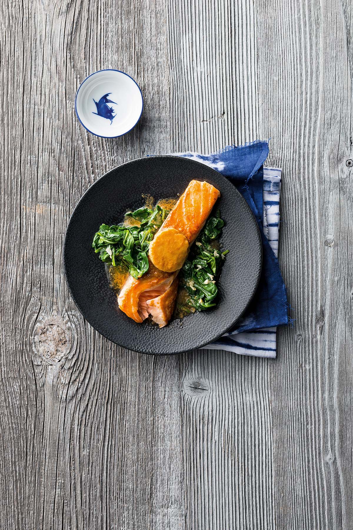 4. Japanse zalm met misoboter, spinazie & knoflook