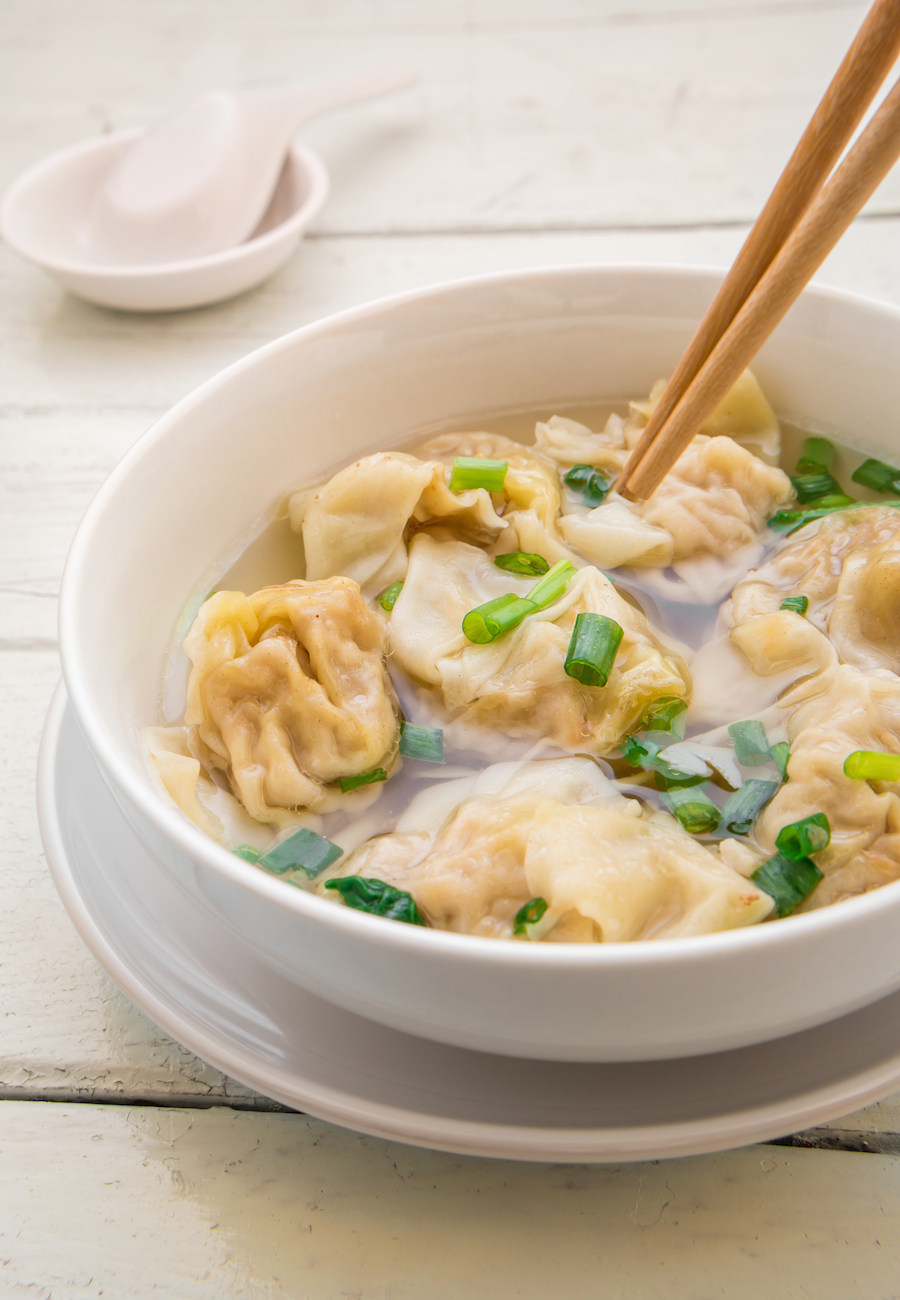 Het is het ultieme comfort food: wontonsoep. De soepbasis maak je eenvoudig van kippenbouillon (gebruik een blokje of verse bouillon) met een scheutje sojasaus en sesamolie (de olie pas toevoegen na het koken).