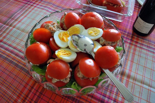 Een erg simpel, maar onweerstaanbaar gerecht is tomaat-garnaal, of tomate-crevette. Een tomaat wordt gevuld met noordzeegarnaal, mayonaise en -naar smaak- ei, peterselie en wat zout en peper.