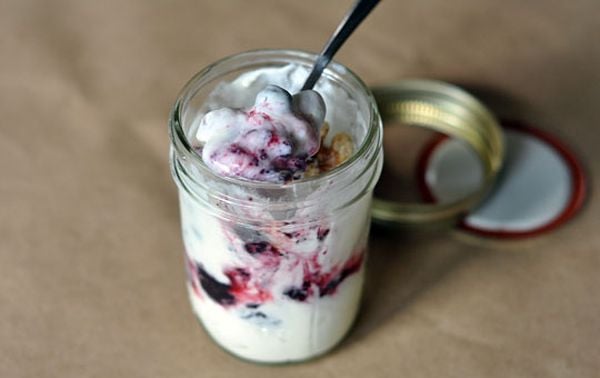 Neem yoghurt met fruit en granola of muesli mee in een glazen pot of to-go beker.