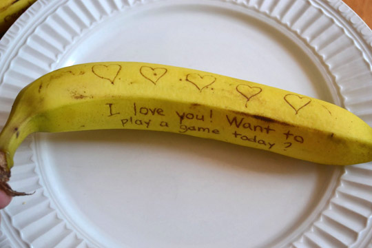Schrijf wat liefs op een banaan en stop ‘m in de lunchtrommel van je lover. Zie hier voor de instructies.