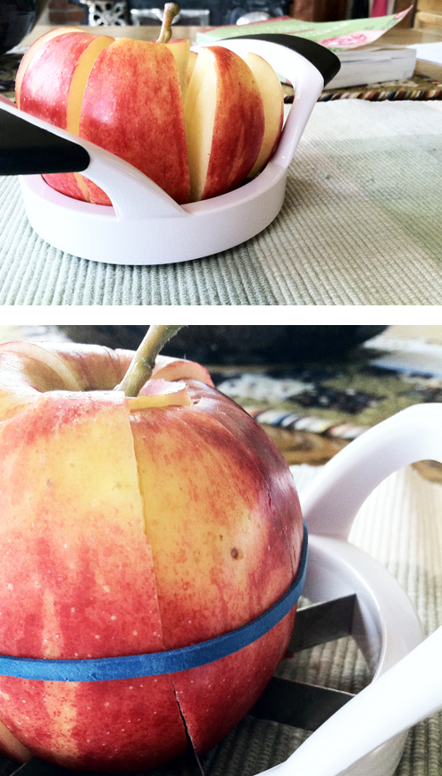 Snijd een appel in partjes en bewaar met een rubberen (post)elastiek eromheen, om te voorkomen dat -ie bruin wordt.