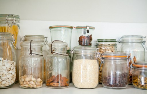 1. Gooi al je plastic bakjes weg, en bewaar je voorraad in glazen potten. Er is geen mooier aangezicht dan een voorraadkast vol glazen potten, bovendien is het een stuk handiger omdat je in één oogopslag ziet wat je nog hebt. Kies daarom voor glazen potten (verkrijgbaar bij o.a. Hema, Ikea en Xenos) die gelijk een opgeruimde look creëren, in tegenstelling tot stapels verschillende plastic bakjes.