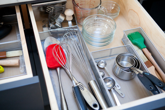 2. Organiseer je la met keukengerei. Winkels als Ikea verkopen handige verdelers voor in lades, zo zie je gelijk welk keukengerei waar ligt en wat je wel en niet hebt. Handig is dat je ze kan verstellen naar wens, ga je voor meerdere kleine vakken? Of vind je lange, grote vakken fijn? Alles is mogelijk. Ook handig: gebruik kleine metalen bakjes zonder deksel om je lades te verdelen.