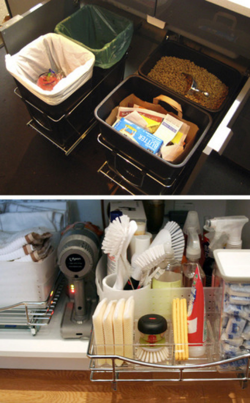 3. Scheid je afval in de keuken en maak een schoonmaakstation onder je wasbak. Gebruik verschillende prullenbakjes voor je verschillende soorten afval als plastic, glas, papier en groen. Zet alles netjes onder je wasbak of in een ander kastje, of nog handiger: in een diepe la.