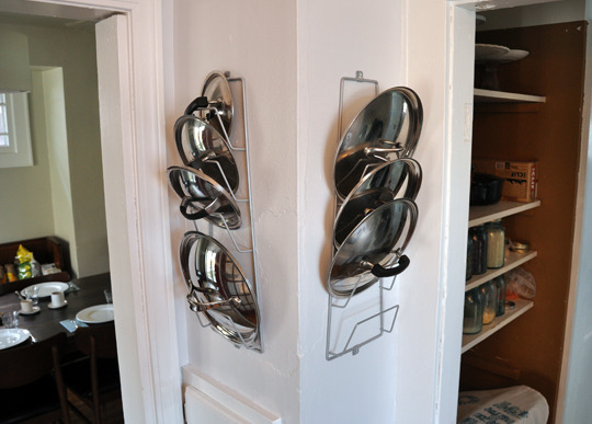 5. Gebruik een tijdschriftenrek voor het bewaren van je deksels. Als er iets is wat bij zo goed als iedereen altijd in de weg ligt, zijn het deksels wel. Je kan ze niet of nauwelijks stapelen en als je ze op je pannen legt, liggen ze alleen maar in de weg. Hang daarom een tijdschriftenrek aan een loze muur, de binnenkant van een kastje of aan de deur van je voorraadkast. Ideaal voor het opbergen van deksels.