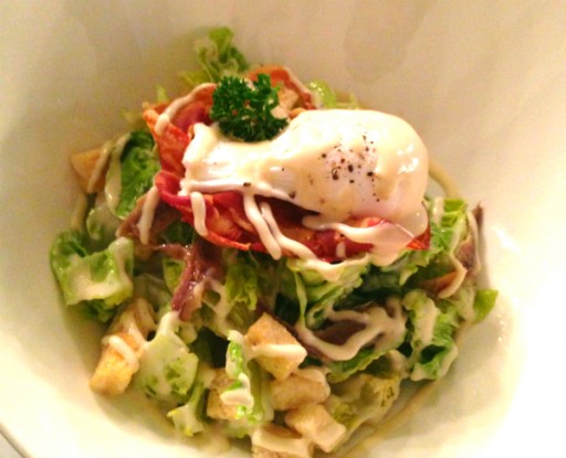 5. Caesar salade met panchetta en een gepocheerd eitje