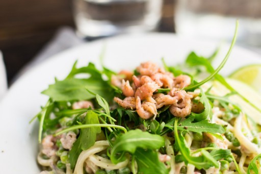 Spaghetti met Hollandse garnalen, rucola en citroen