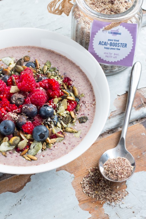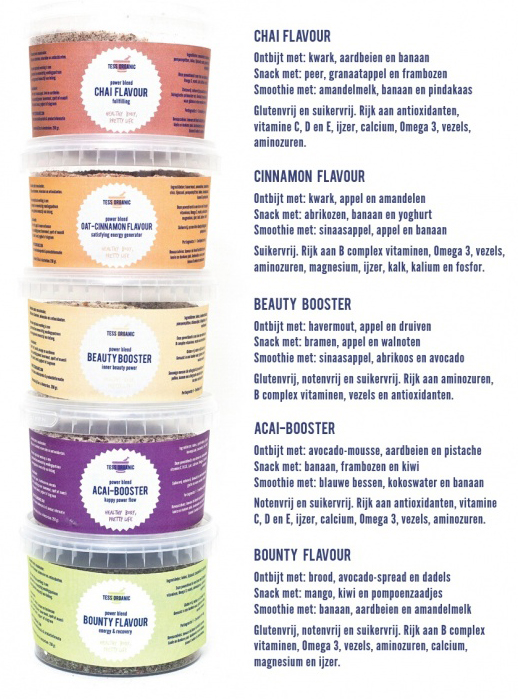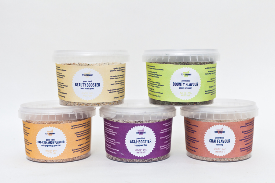 En toen kwamen we Marloes Hoogendoorn tegen. Een natuurvoedingsdeskundige, een echte health foodie en de eigenaresse van de webshop Tess Organic. Zij bedacht Powerblend, een mix van allerlei biologische superfoods, verkrijgbaar in vijf smaken. De mix is redelijk fijn (grover dan poeder) en lekker om te eten in je yoghurt, sapjes en smoothies, over vers fruit, en zelfs op je boterham.