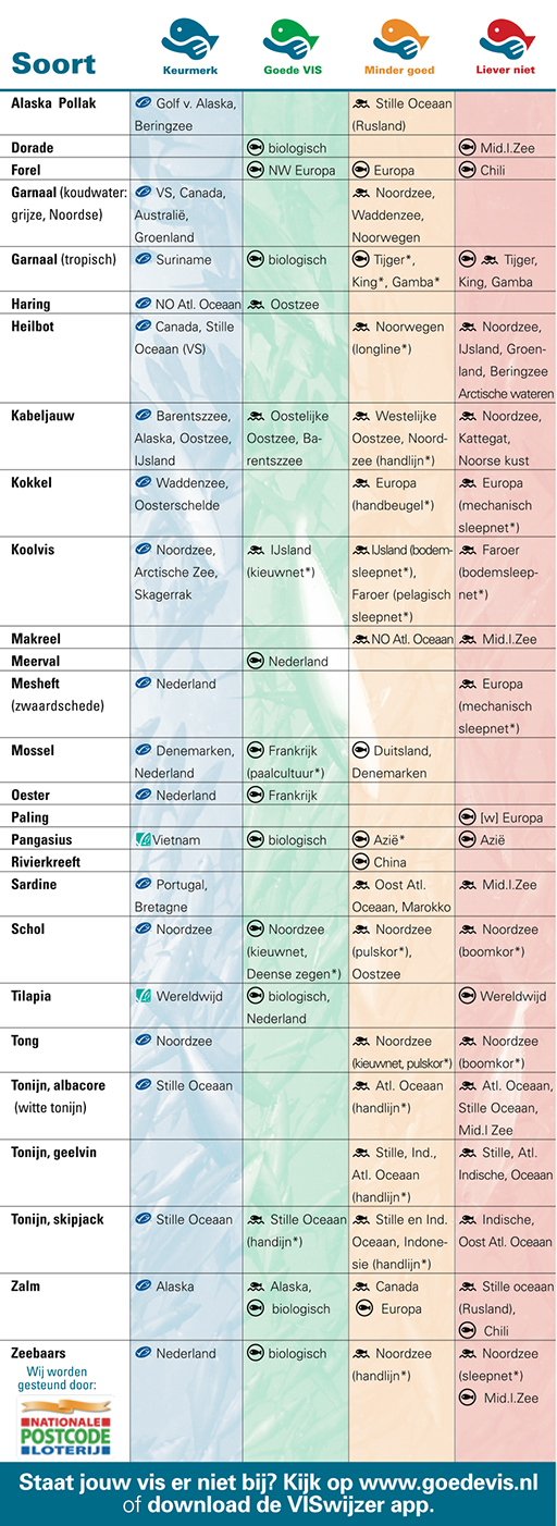 Maar welke vis kun je nu wél eten? Daar is de VISwijzer voor, die je kunt raadplegen via een app en de website. We hebben hem ook hieronder toegevoegd. Zo lees je bijvoorbeeld dat haring uit het noordoosten van de Atlantische Oceaan, schol, tong en koolvis uit de Noordzee en zalm uit Alaska prima te eten is. Deze zijn duurzaam gevangen en bevatten geen schadelijke stoffen. Bekijk voor de hele lijst de VISwijzer, dit zijn slechts een aantal voorbeelden.
