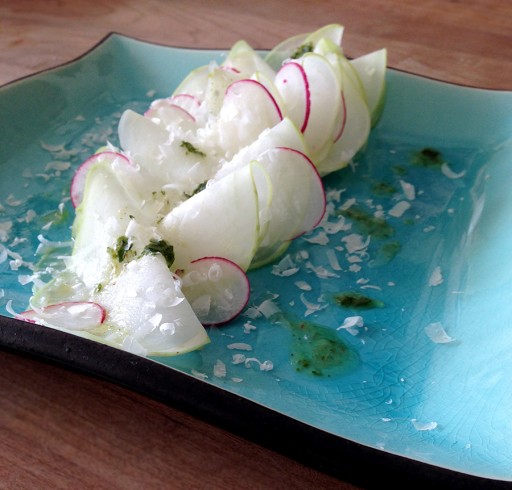 Je kan het jezelf heel makkelijk maken door de koolrabi in dunne plakken te snijden met een kaasschaaf of mandoline en te serveren met olijfolie en grof zeezout. Ook lekker met Parmezaanse kaas zoals in deze carpaccio van koolrabi.