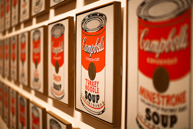 De meesten van jullie kennen het schilderij wel, Andy Warhol’s werk genaamd “Campbell’s Soup Cans” met foto’s van soepblikken van het Amerikaanse merk Campbell. Andy Warhol maakte in 1962 het schilderij van de 32 soorten soep en varieerde met de gebruikte kleuren in de jaren er na door bijvoorbeeld de standaard kleuren te vervangen door felle kleuren als paars, blauw en geel.