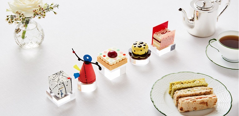 Maar ook kleine sandwiches, verse scones en kleine chocolaatjes behoren tot het repertoire van chef patissier Mark Perkins. Zijn laatste vijf creaties baseerde hij op de werken van kunstenaars die op dit moment exposeren in Londen. Dat zijn Yayoi Kusama, Damien Hirst, Alexander Calder, Banksy en Mark Rothko.