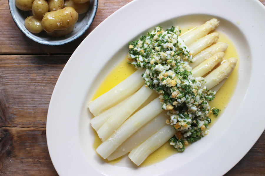 > Naar het recept: witte asperges à la Flamande met ei, peterselie en boter