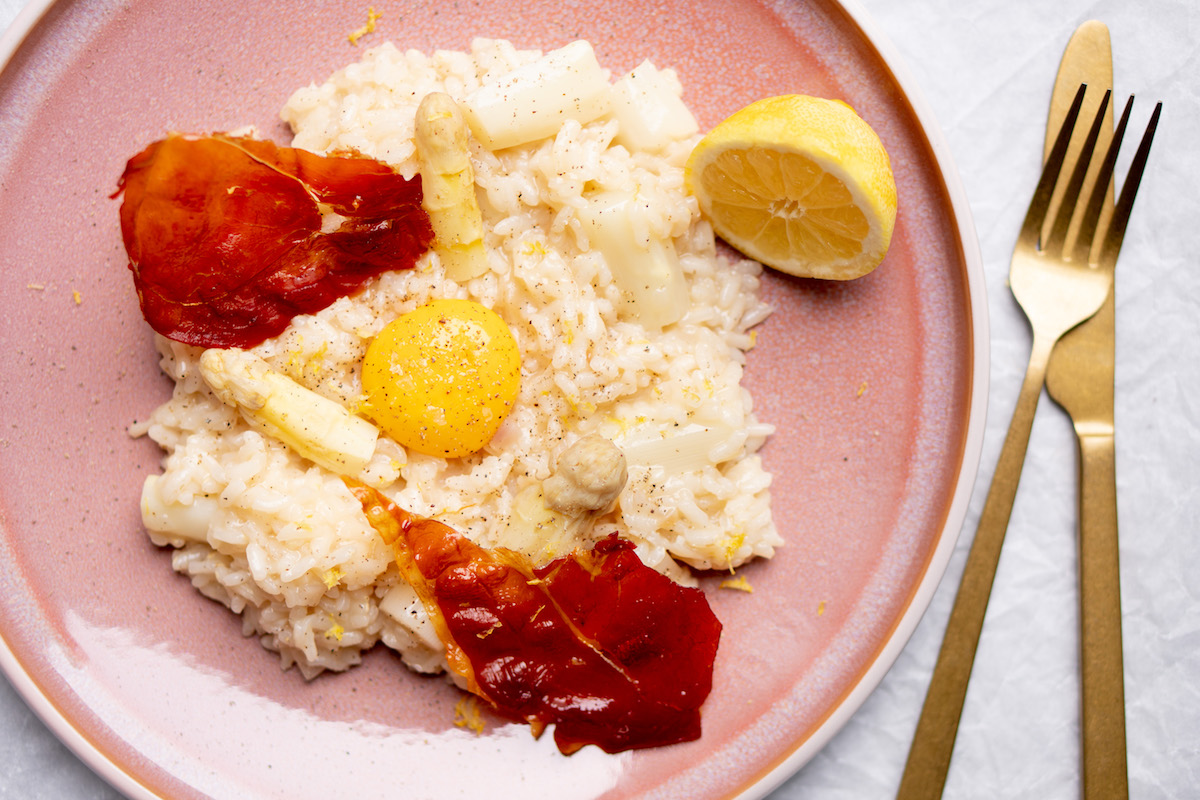 7. Risotto met witte asperges en krokante parmaham