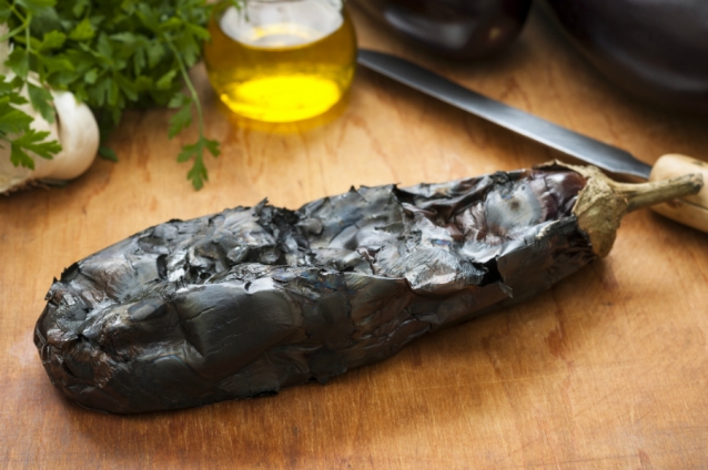 Om aubergine te roosteren houd je de vrucht in z’n geheel boven vuur. Dit kan een barbecue zijn, maar ook gewoon op het gasfornuis. Leg de aubergine op de gaspit en draai om de paar minuutjes, zodat hij gelijkmatig gaart en niet volledig verbrandt aan één kant.