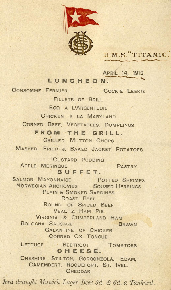 Op het menu, dat overigens nog in perfecte staat verkeert, staan gerechten die à la carte konden worden besteld, maar ook bij het buffet konden worden gehaald. Denk aan bijvoorbeeld Argentijnse eieren, corned beef en custard pudding.