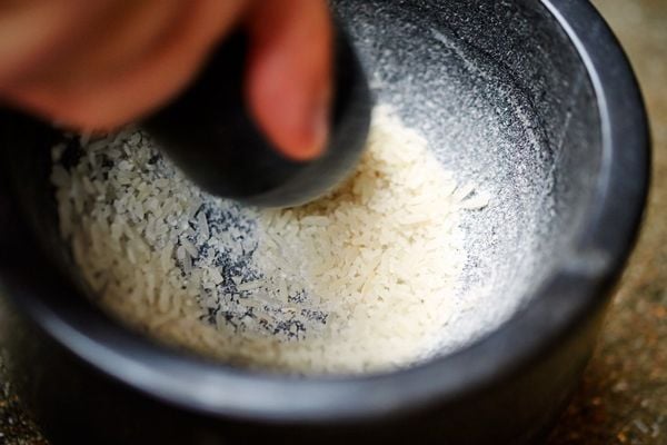 Neem een klein handje droge witte rijst. Plet, draai en schaaf de rijst fijn in de vijzel. Helemaal rondom. Niet aaien, maar flink wat kracht zetten.