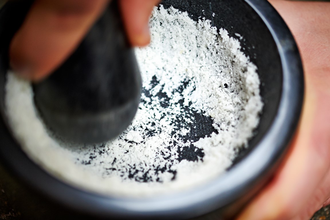 Draai door tot overal een laagje kokos zit. Laat nu een paar uur staan. De olie die in de kokos (of pinda’s) zit, zal langzamerhand in de ‘poriën’ van de vijzel trekken. Op deze manier ontstaat er een oliehoudend laagje in de vijzel die voor een groot deel zal voorkomen dat er smaken en geuren in de vijzel trekken.