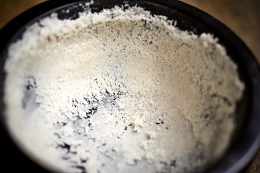Zodra het grootste deel van de rijst is fijngemalen tot poeder, herhaal je dit proces nog een keer. Als het poeder na de tweede keer vijzelen nog steeds kleine stukjes steen bevat, herhaal je het nog eens. Twee keer was bij mij voldoende. De rijstmeel (want dat maak je in feite) moet helemaal wit uit de vijzel komen.