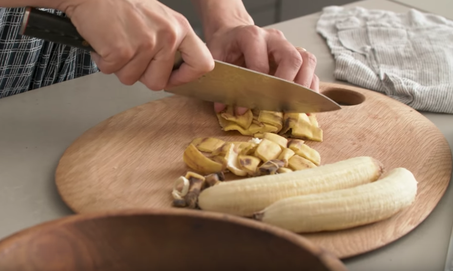 Er is wel een gedeelte van de schil die je niet gebruikt. De droge puntjes aan de uiteinde van de bananenschil snijd je er af, want deze kun je niet in de taart verwerken. En let op: de banaan zelf gebruik je ook niet, dus die kan je lekker opeten (of even bewaren in de koelkast).