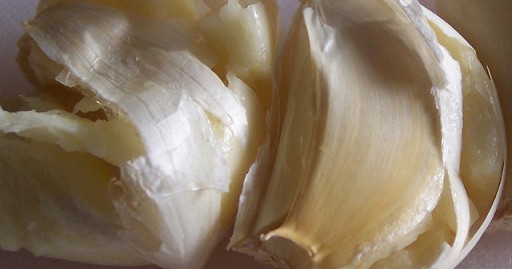 Knoflook kneuzen: “je moet altijd met het snijvlak van je mes een teentje knoflook met schil en al kneuzen. Dat scheelt je al het gepiel.”