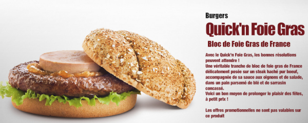 Bij de Franse fastfoodketen Quick verkochten ze begin dit jaar de Quick’n Foie Gras; een limited edition hamburger met een plakje bloc de foie gras. Het motto van dit broodje luidde: “Your New Year’s resolutions can wait.”