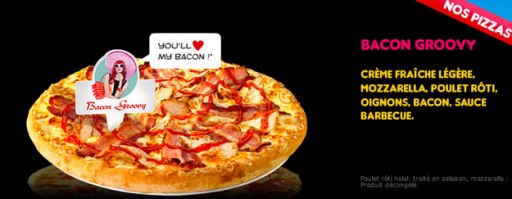 De Franse Domino’s Pizza kwam met de Bacon Groovy: een pizza met crème fraîche, mozzarella, geroosterde kip, uitjes, barbecue-saus en bacon.