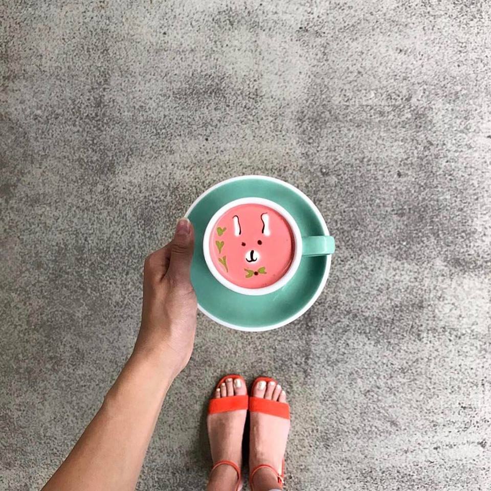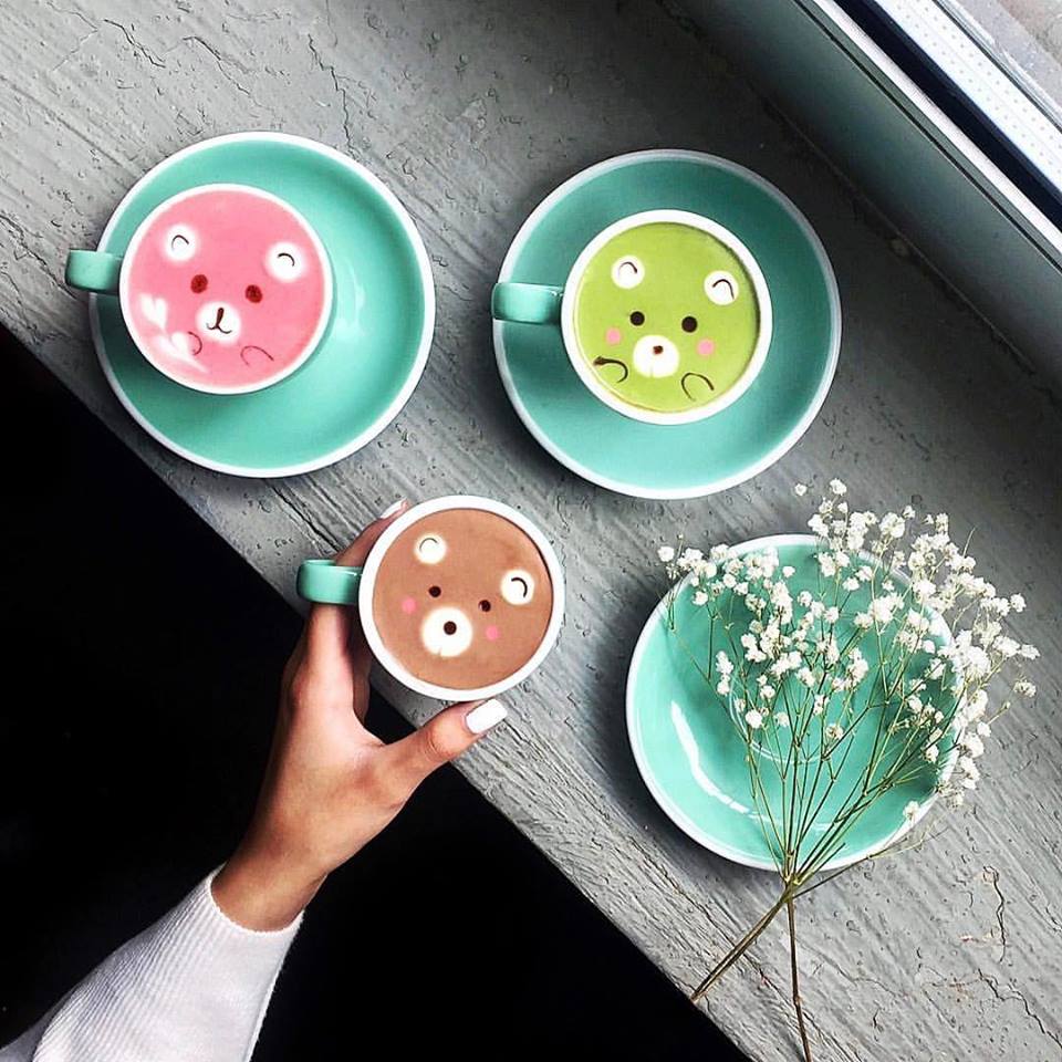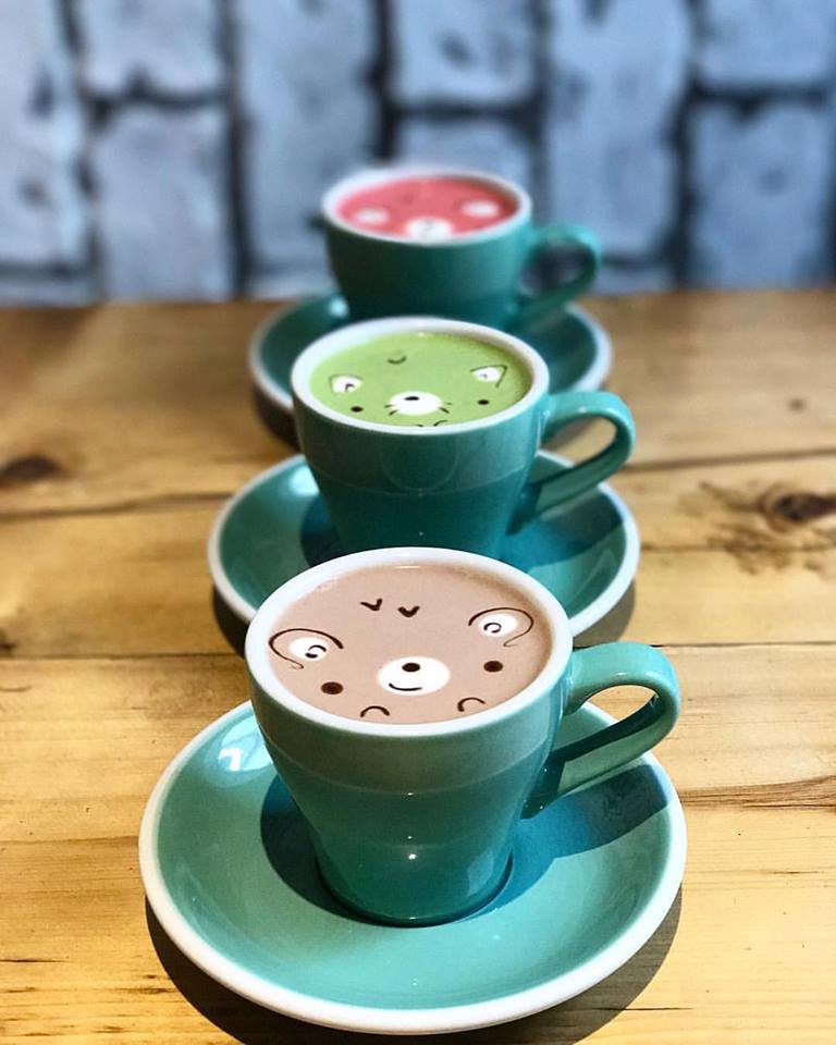 Zo krijg je een roze kopje koffie voor je neus met een beer die je aanstaart. Of een groene koffie met een kat.