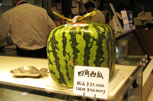 Deze vierkante (!) meloen heeft een prijskaartje van €158,95. Slik. Dan moet je wel érg veel van meloenen houden.