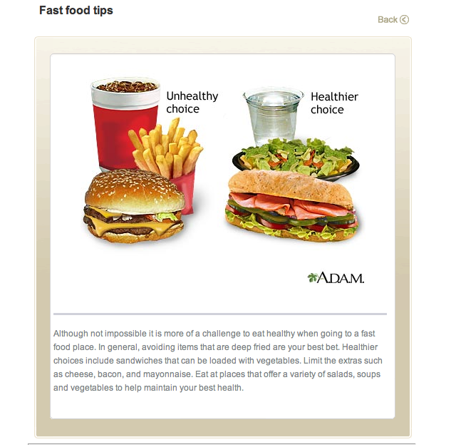 In een ander artikel op de website wordt een ‘goed’ en een ‘slecht’ voorbeeld geschetst van fastfood. Een hamburger met Franse frietjes wordt hierbij gezien als ‘ongezond’, een broodje ham met groenten, een salade en een glas water is een ‘gezondere keuze’.