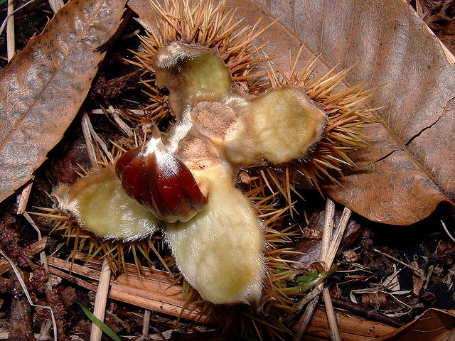 Kastanjebomen kennen we natuurlijk ook in Nederland (vooral in het Zuid-Oosten van ons land). De kastanjes groeien in groene stekelige bolsters die uiteindelijk uitdrogen en opensplijten.
