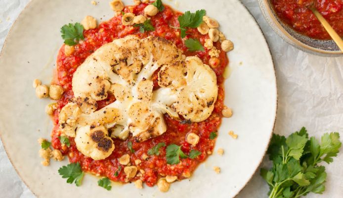 Harissa – jeweetwel, die pittige Noord-Afrikaanse kruidenpasta – is ontzettend rijk aan smaak en leent zich geweldig om een (hele) bloemkool mee in te smeren. Dat is in de basis al heel lekker, maar als je nog een stapje verder wil gaan kun je de harissa op voorhand nog even mengen met wat maple syrup, zeezout en shoarmakruiden, zoals The Minimalist Baker doet.