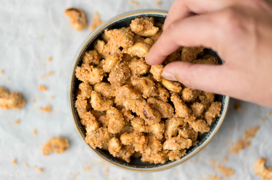 In honing geroosterde cashewnoten (zelf maken of bij de notenboer): zoet, zout en knapperig. Perfect tegen de flauwheid van al te brave kaas.