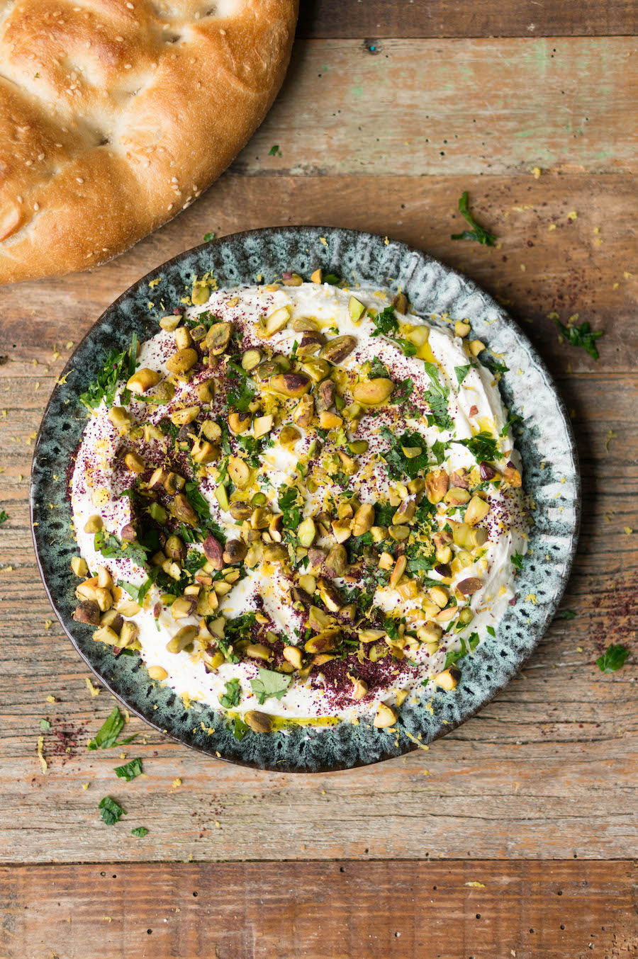 Labneh met olijfolie en za’atar: die dikke, romige yoghurt is het perfecte frisse tegenwicht voor zwaardere hapjes.