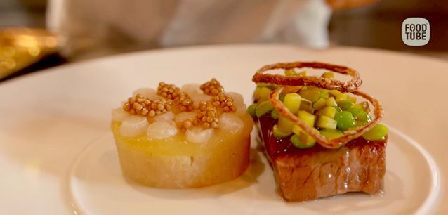 Gepofte knolselderij, gepoft op 180 graden in de oven, vormt de basis van het gerecht. En uiteraard de beroemde kapucijners, maar dan kort geblancheerd én dubbel gedopt. Even een werkje, maar dan zijn ze wel het állerlekkerst. Luc noemt het ‘groentekaviaar’. Daarbij appelmoes als garnituur, gemaakt van zurige Hollandse Granny Smith-appels.