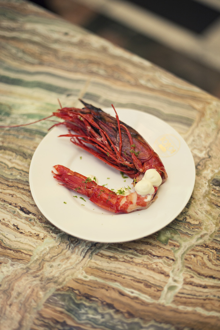 Wij aten het beestje voor het eerst bij La Grande Brasserie Bodon, in het Apollo Hotel. Daar liggen ze met hun schoonheid te pronken op ijs, aan de bar. Wij aten de rode reuzengarnaal daar perfect gegaard, met alleen wat fijngehakte peterselie erover en toefjes crème fraîche ernaast. En wil je ’t helemaal goed doen, dan eet je niet alleen de staart, maar zuig je daarna ook de kop uit. Als je durft.
