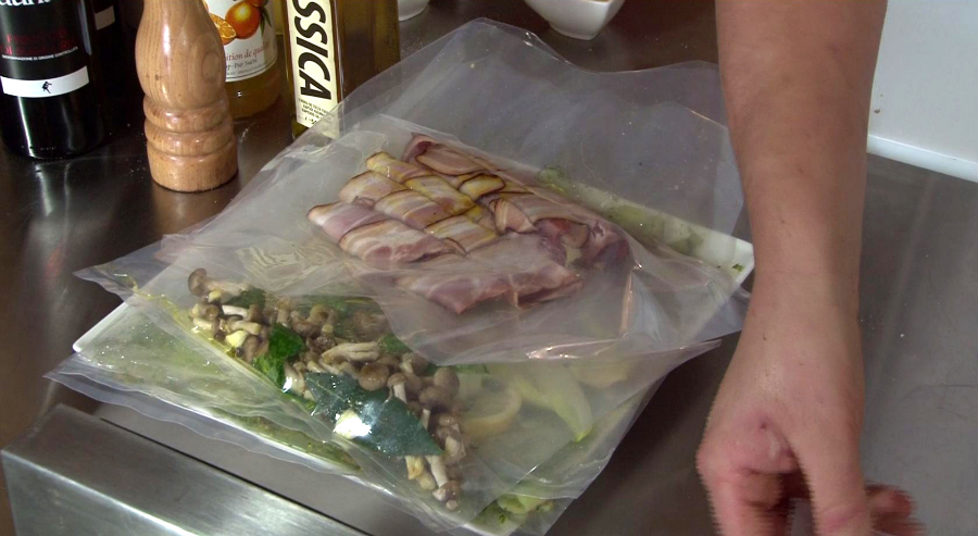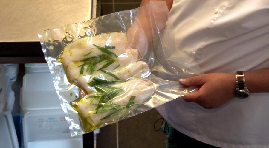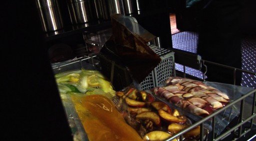 Wanneer je je bedenkt dat een vaatwasser temperaturen rond de 65 graden bereikt met veel stoom en water, wordt het al een stuk logischer. Om te voorkomen dat de smaken in contact komen met eventuele overgebleven chemicaliën en de grote hoeveelheid water, werden alle ingrediënten per gerecht geseald in plastic zakjes.