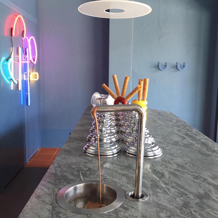 De salon beschikt bovendien over een chocoladetap. Werkt ongeveer zoals een biertap, maar dan met vloeibare chocolade… OMG.