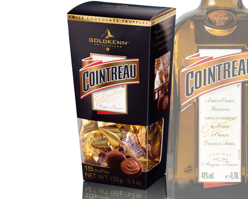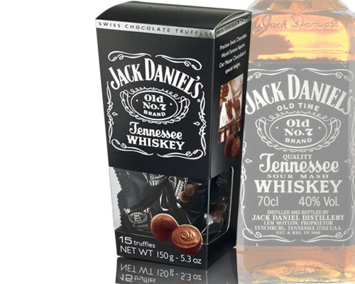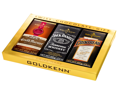 Het Zwitserse bedrijf Goldkenn heeft chocolade met daarin de whiskey Jack Daniels, de cognac Remy Martin en de likeuren Cointreau en Grand Manier op de markt gebracht. In de Zwitserse alpenmelkchocolade zit een siroop met daarin de sterke dranken.