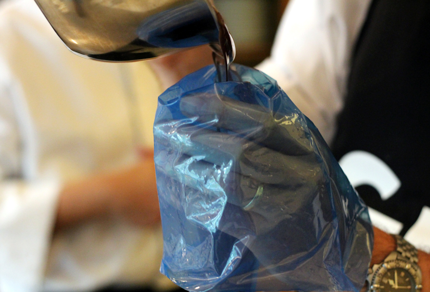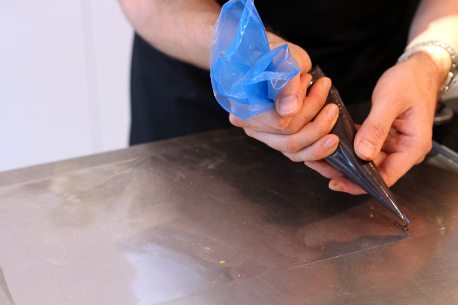Stap 2: laat de gesmolten chocolade een paar minuutjes afkoelen en giet deze dan in een spuitzak. Knip er een klein stukje af; hoe kleiner het puntje, hoe fijner je kunt werken. Je kunt hier ook ideaal plastic druk & sluitzakjes voor gebruiken.