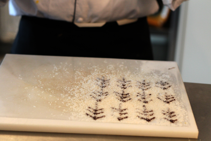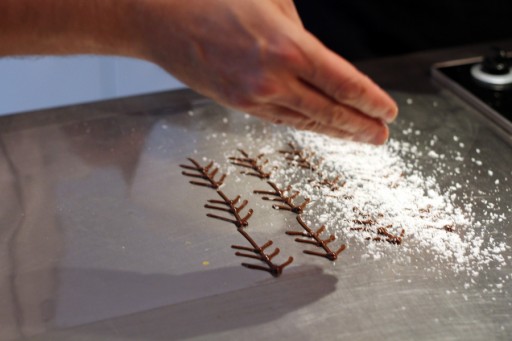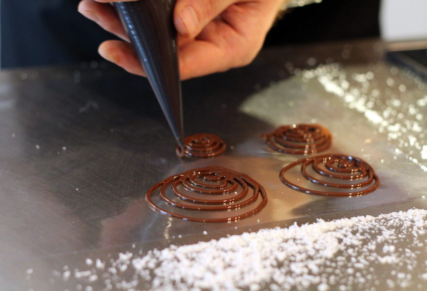 Stap 1: smelt chocolade (wit, melk, puur…) au bain-marie. De chef gebruikte 60 % pure chocolade.