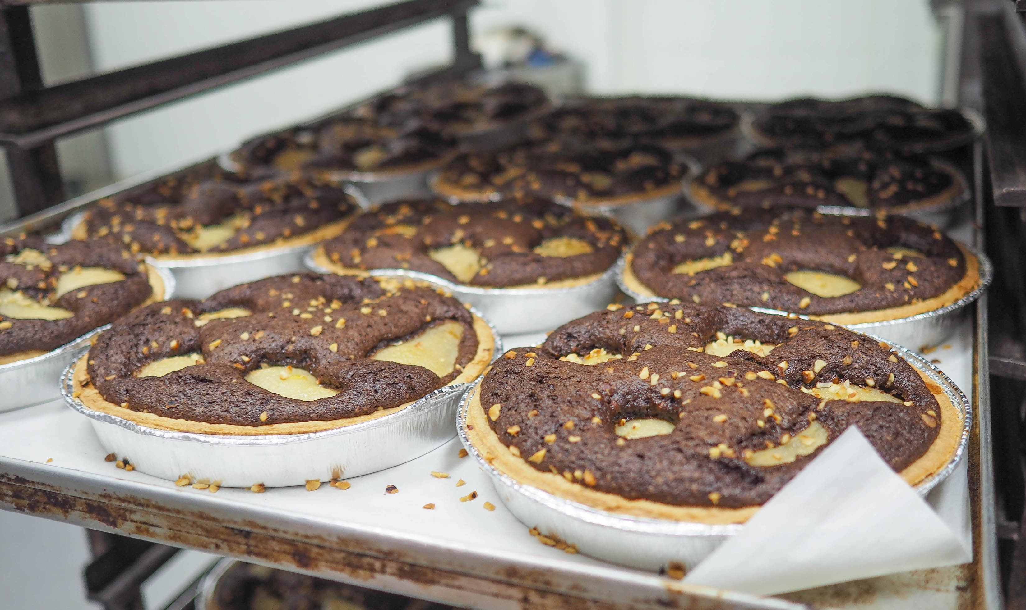 Even verderop staat een rek met speculaas-taarten, die net uit de oven zijn gekomen. In deze bakkerij worden de taarten, koeken en chocolade gemaakt voor álle filialen van de Bijenkorf. Maar ook de gebakjes en chocolade van andere winkels van deze leverancier worden hier gemaakt.
