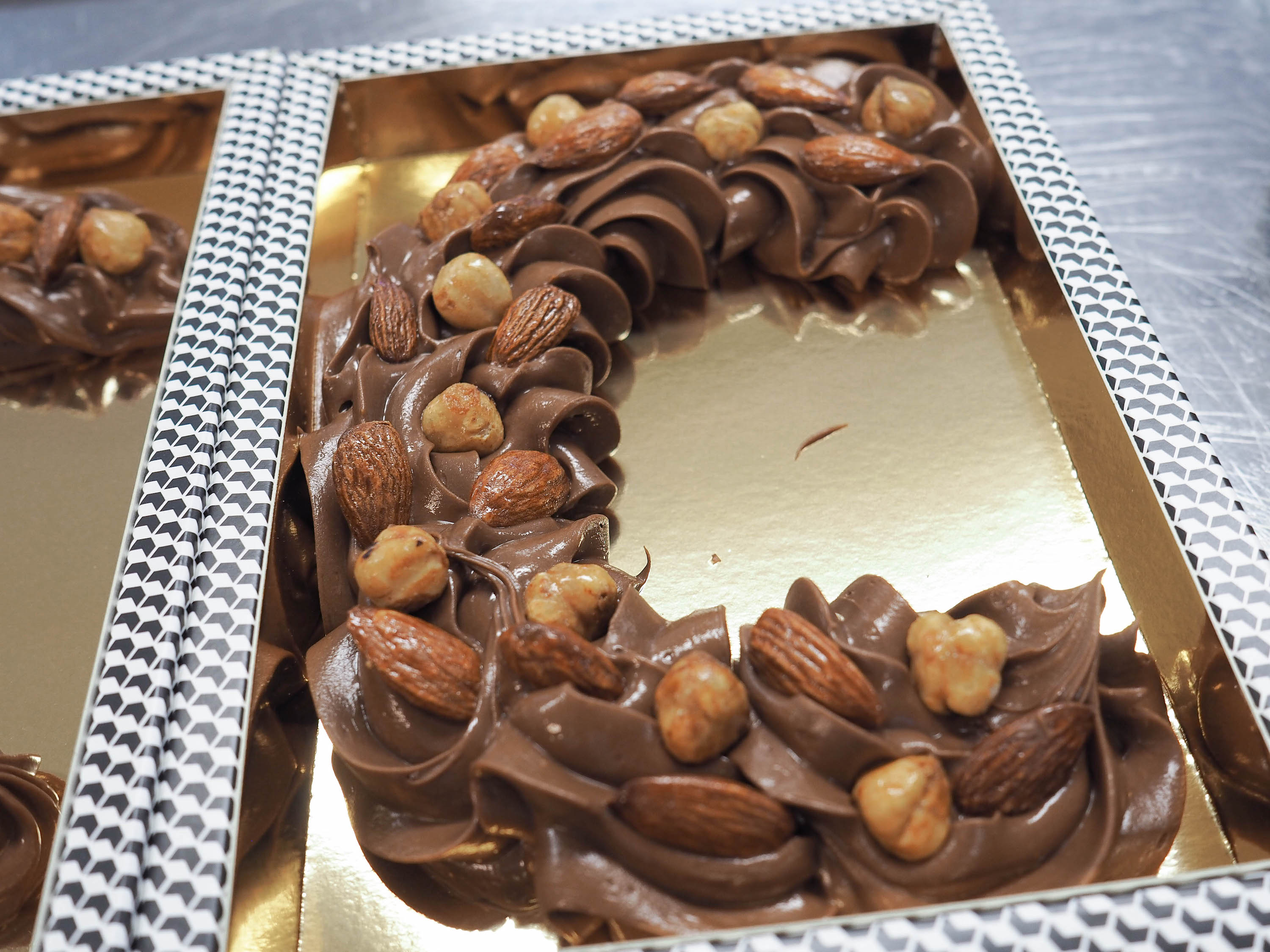 De chocoladeletters zoals die hier worden gemaakt met een spuitzak, worden trouwens niet op deze manier verkocht. Maar natuurlijk worden er bij de Bijenkorf wel heerlijke chocoladeletters met noten verkocht, gemaakt van dezelfde chocolade.