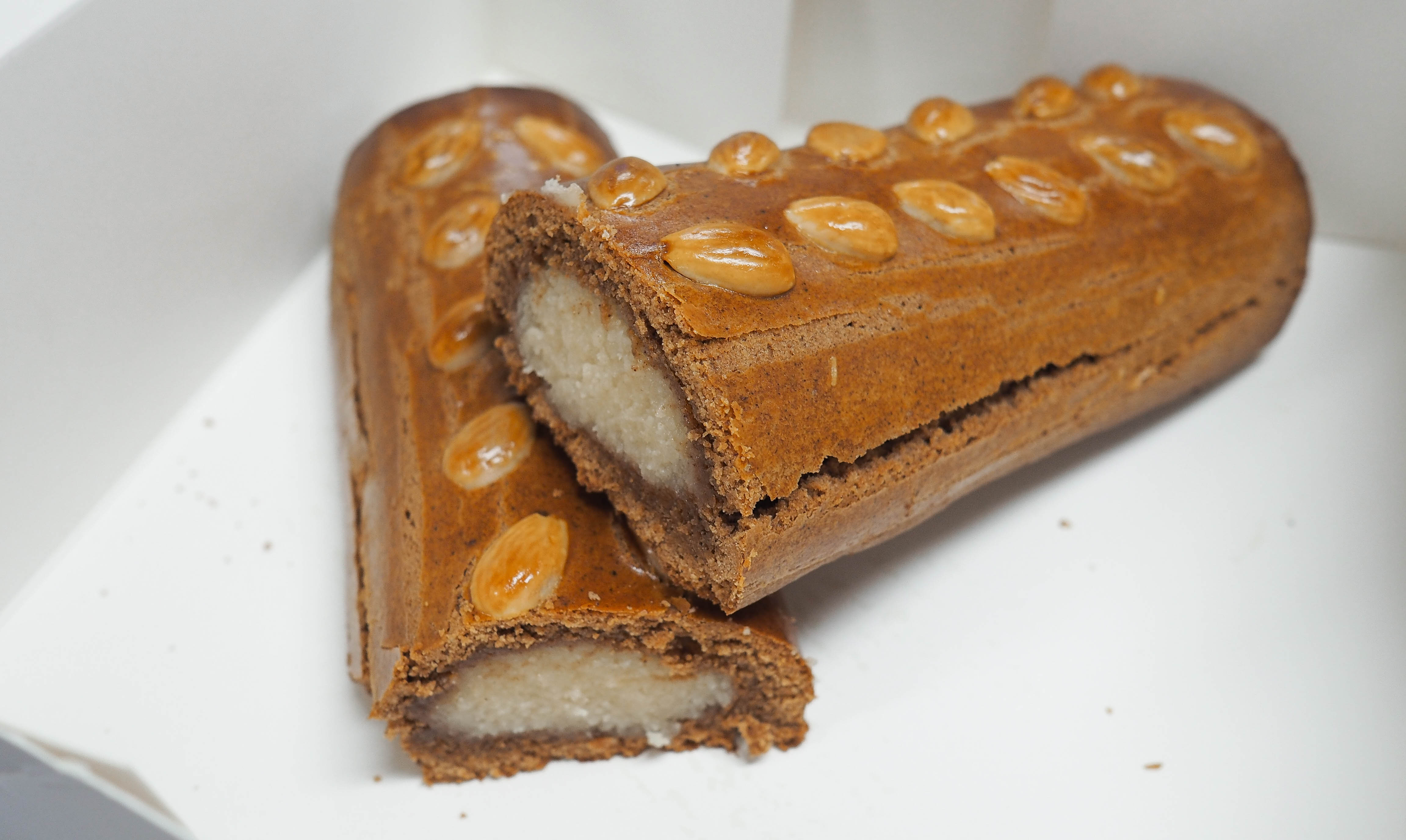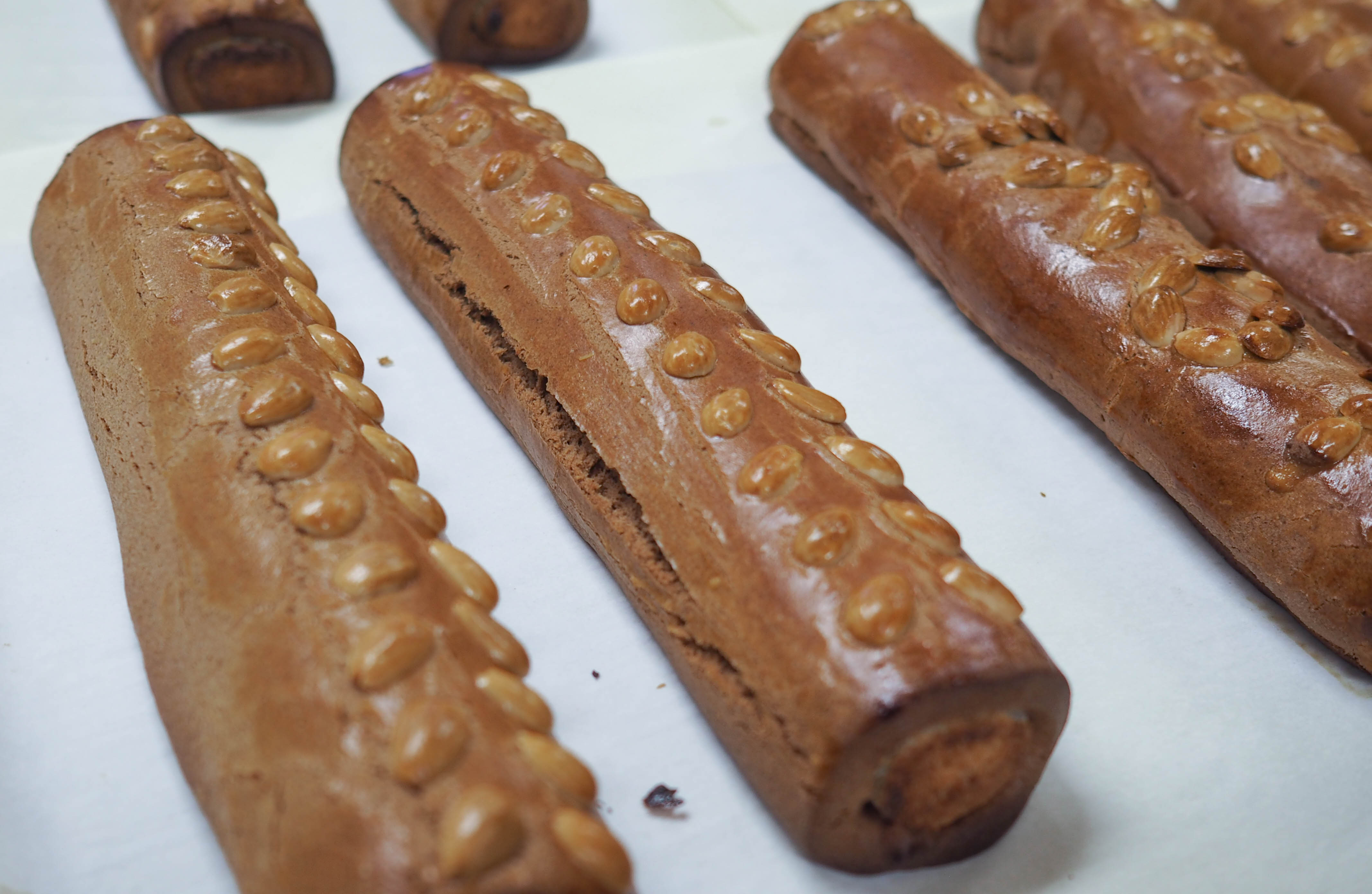 Na onze zelfgemaakte chocoladeletters hebben we de smaak te pakken en mogen we nog de beroemde gevulde speculaasstaven van De Bijenkorf maken. Het deeg en de spijs liggen al klaar, dus het is een kwestie van uitrollen en versieren. En natuurlijk mogen de halve amandelen op de gevulde speculaas niet ontbreken.