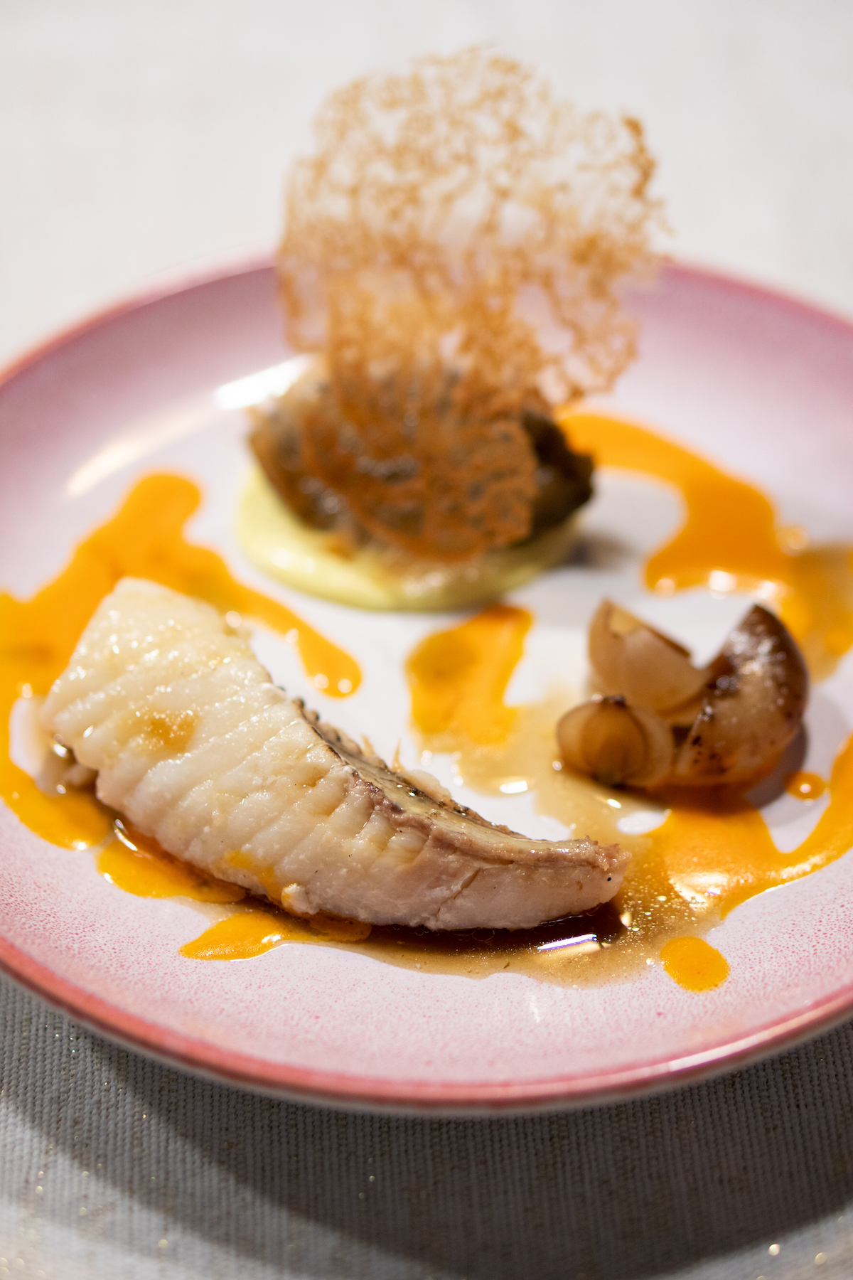 Wij aten heerlijke rauw gemarineerde zalmforel die kakelvers was (de boodschappen werden ook geleverd door Schmidt Zeevis, één van de initiatiefnemers van Cook Like a Chef), met plakjes ingelegde pompoen en een saus van amandelsherry en maggiplant. Daarna zeeduivel die we kort opwarmden in de pan, geserveerd met gepofte aubergine en beurre blanc van gefermenteerd paprikasap.