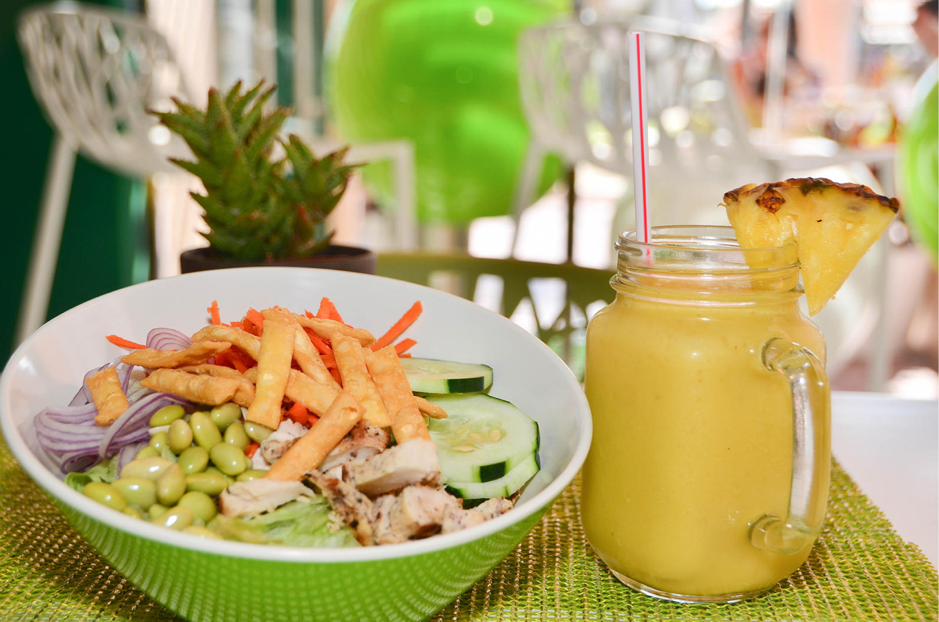 Een van onze favoriete salades is de Aruba salad met garnaaltjes, avocado, palmhart, wortelen en Romeinse sla. Deze frisse salade spoelen we vervolgens weg met de Blueberry Booster. Een niet te versmaden smoothie gemaakt van blauwe bessen, banaan, komkommer, spinazie en rijstmelk. Bij Garden Fresh kun je ook je eigen salade samenstellen.
