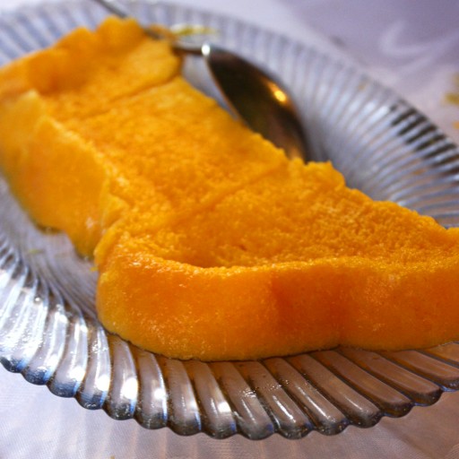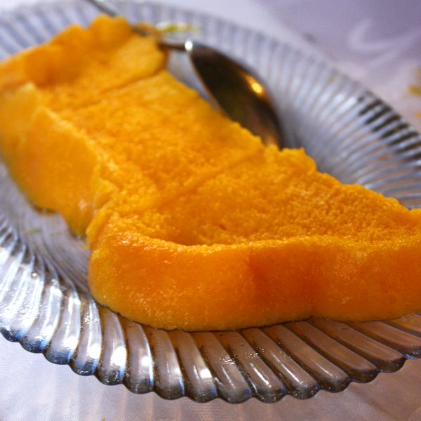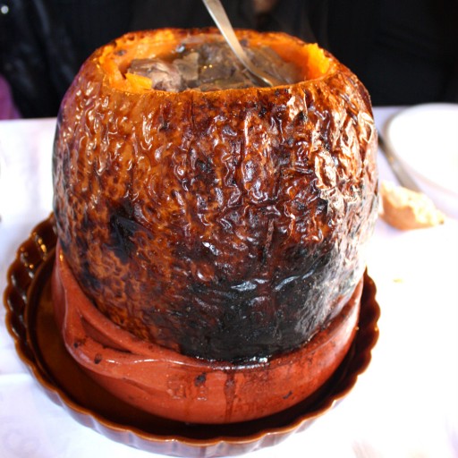 “Coelho na Abóbora”: konijnenvlees geserveerd in een pompoen. Portugal is een land waar vrij veel konijn wordt gegeten. Het smaakt qua structuur naar kalkoen, erg lekker! Eerst wordt het konijn gekookt buiten de pompoen, vervolgens gaat het vlees in de pompoen en gaat het in zijn geheel de oven in.