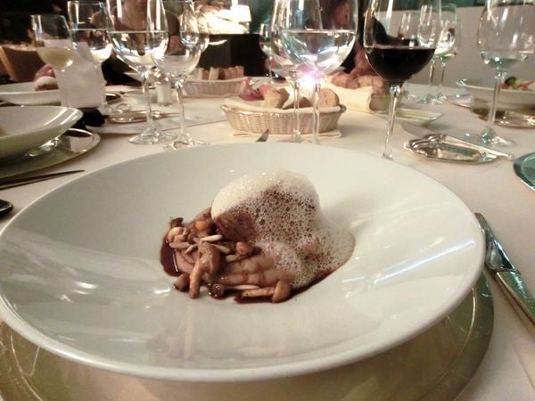 Als hoofdgerecht aten we een geroosterd stukje mals kalfsvlees, geserveerd met een puree van kastanjes en een garnering van champignons en zwarte pepersaus.