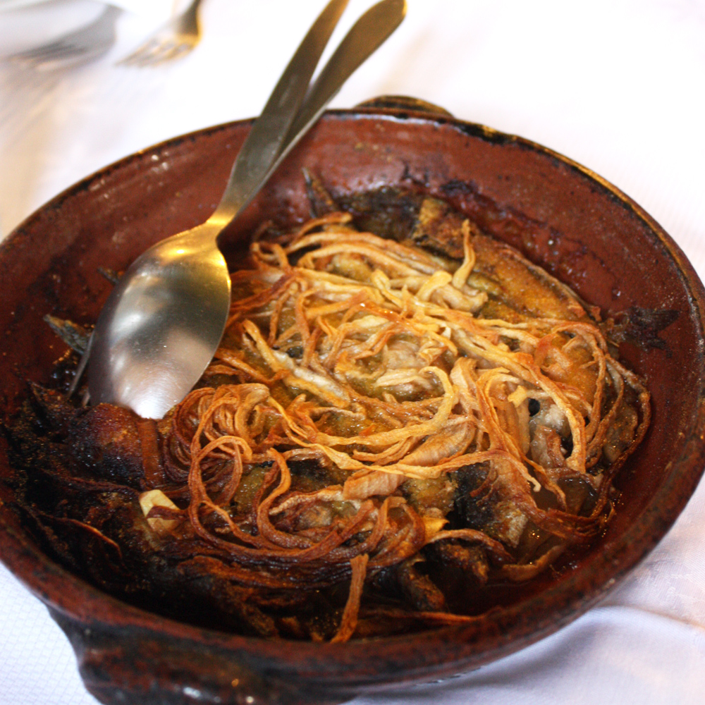 “Petingas no forno”, een gerecht van onder andere uien en sardientjes. Het krokante laagje erop ontstaat doordat ze het in de oven bakken.